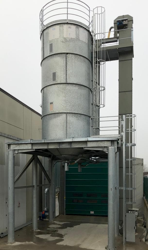 Silos de stockage pour copeaux de bois à section circulaire, réalisés en tôle d’acier de haute épaisseur calandrée et intégralement galvanisée à chaud. Chambre de stockage (de 20 à 500 m3 de capacité) avec extracteur motorisé du type à cardans (jusqu’à 140 m3) ou avec circulation forcée par le biais